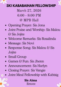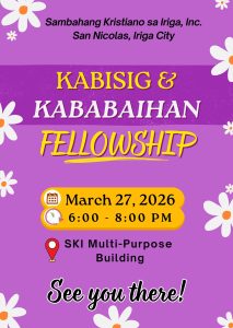 All Events This event has passed. Kabisig and Kababaihan Fellowship March 27 FREE Add to calendar Google Calendar iCalendar Outlook 365 Outlook Live Details Date: March 27 Cost: FREE Event Category:Men's, Women's Website: https://skiriga.org/event/kabisig-and-kababaihan-fellowship Organizer Women’s Venue SKI Main Hall San Nicolas, Iriga City, Camarines Sur 4431 Philippines Phone: 0542992142